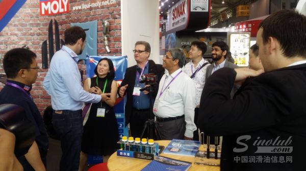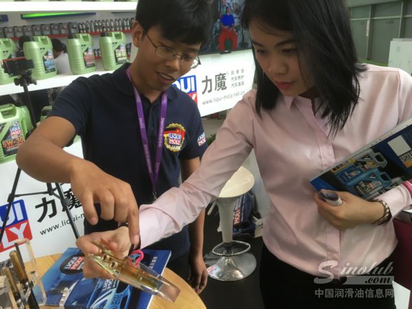 多种新品的展示同时推出吸引了大批新老客户驻足观望,尤其是一排排整齐的绿瓶机油引起了大家极大关注,大量的咨询让销售经理应接不暇,德方同事只好一齐上阵服务客户。而这些绿瓶机油就是力魔的新系列机油——魔法基因,从5W30到5W50的不同种类足够应付普通乘用到专业改装,最新技术的有机钨抗磨剂在摩擦保护的同时赋予其磨损修复的能力,在紫外线下的荧光反应更成为检修查漏好帮手!