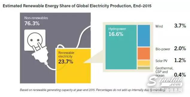 截至2015年底,可再生能源发电占全球发电总量的比例已经上升到了23.7%,其中,水电占比16.6%,依然是可再生能源中的贡献大户。