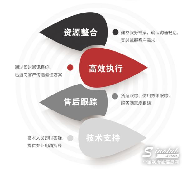 具体来说,资源整合包括建立服务档案、确保沟通畅达、实时掌握客户需求,充分整合各项资源,集中为客户服务;高效执行,指通过即时通讯系统,迅速向客户传递最佳方案,及时帮助客户解决产品疑难问题;售后跟踪指通过货运跟踪、使用效果跟踪、服务满意度跟踪等方式了解客户对产品的评价,以期不断完善产品品质与服务方式;技术支持指技术人员为客户提供的即时答疑,并为客户提供专业的用油指导。