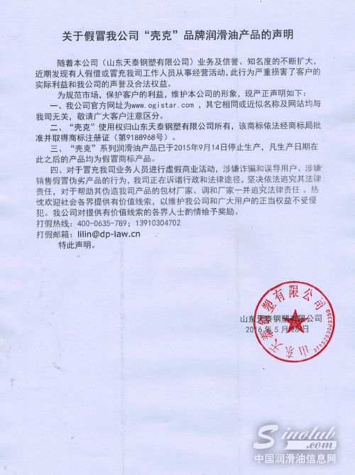 三、“壳克”系列润滑油产品已于2015年9月14日停止生产,凡生产日期在此之后的产品均为假冒商标产品。