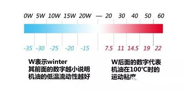 “W”表示winter冬季,其前面的数字越小说明机油的低温流动性越好,机油可供使用的环境温度越低,在冷启动时对发动机的保护能力越好。简单来说就是结冰点温度,如常见的0W是-35℃,5W是-30℃,10W是-25℃,15W是-20℃。