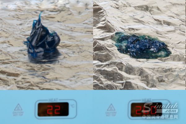 • 抗高温:同时加热两种润滑脂,在温度达到260℃时,测试润滑脂出现析油和氧化结焦现象(见图六),而美孚润滑脂XHP™ 222耐高温性能良好,展现出较高的滴点并保持一定的稠度(见图五)。