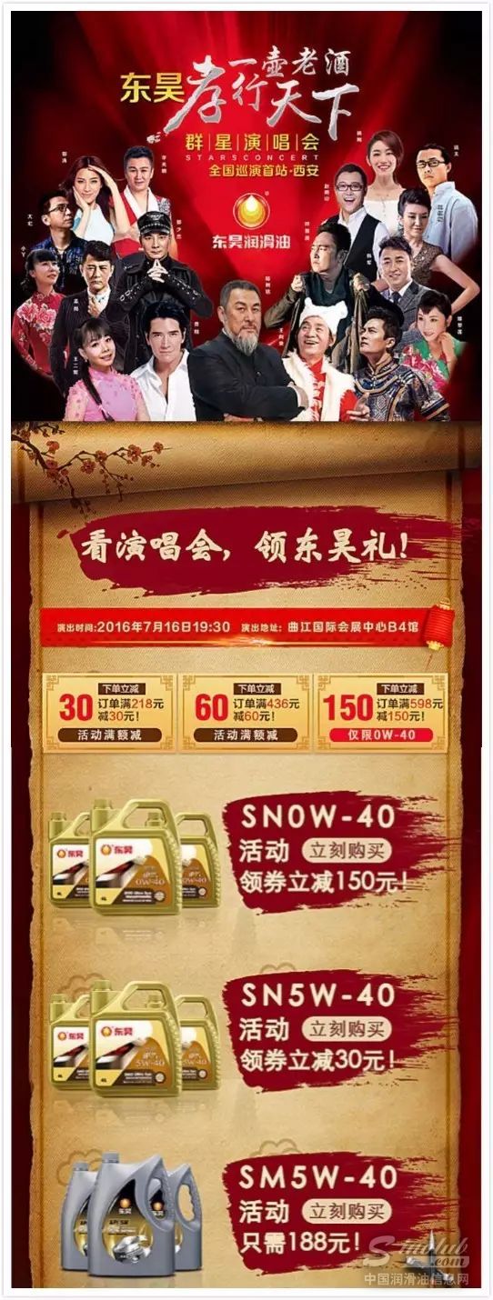 据悉,东昊汽车用品天猫旗舰店为预祝“一壶老酒 孝行天下”西安站演出成功,特针对陕西区域推出特惠活动。7月1日-7月31日之间,陕西区域客户下单即可尊享SN5W40 领券减30元(优惠后188元 ) 、 SN0W40 领券减150元(优惠后448元)活动。