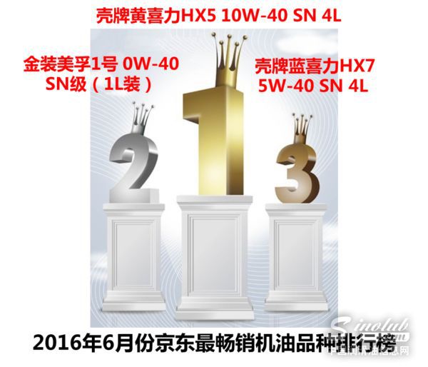 2016年6月,京东电商平台机油销量排行榜发生较大变动,冠军由上个月亚军“壳牌(Shell)黄喜力Helix HX5 10W-40 优质多级润滑油 SN 4L”夺得,排名第二位的则是原先三甲开外的“美孚(Mobil)金装美孚1号全合成机油0W-40 SN级(1L装)”,后来居上的“壳牌(Shell)蓝喜力Helix HX7 5W-40 合成机油 SN 4L”排名第三。尽管如此,京东榜三甲依然由壳牌和美孚两个知名品牌包揽,充分显示了两家企业在运作产品和市场上的深厚内功。作为在机油市场纵横多年的国际大品牌,壳牌和美孚始终以其优良的品质赢得消费者的信赖,立足于不败之地。国产品牌虽正逐步崛起,但也必须不断加强在研发创新方面的投入,提高产品质量,加大品牌推广力度,才能在电商领域与国际品牌一较高下。
