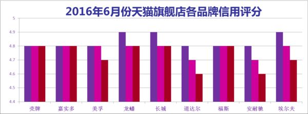 2016年6月份畅销机油天猫旗舰店的信用评分与各月份大体保持不变,之前评分趋势走低的发货速度在本月有所好转。其他如产品描述相符程度以及商家服务态度仍维持在较高的分数水平。从打分和评价上可以看出,消费者对于官方旗舰店有很高的信任度,相信产品的品质,并且对咨询、购买及售后的整个流程基本满意。从消费者评价来看,大多期望加快发货速度,加大产品促销力度,丰富完善现有的线上服务,提高服务质量。