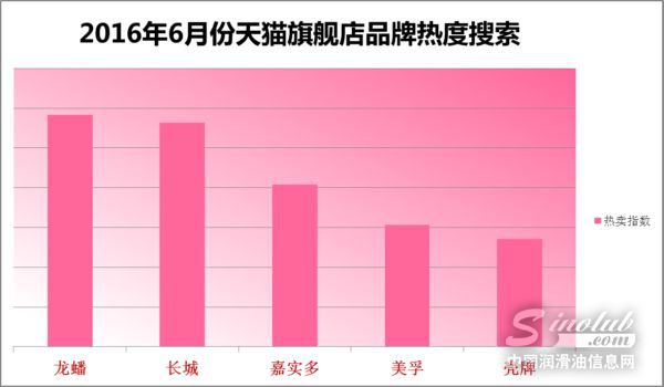机油品牌的知名度在某种程度上影响着天猫旗舰店热度搜索排行。根据机油猫(m.sinolub.com)电商数据中心统计,2016年6月份,民族润滑油品牌龙蟠位列第一。作为后来者的龙蟠借力电商成功带动自身品牌知名度,值得其他润滑油企业的关注和借鉴。国内名牌长城夺得第二名,显示了民族润滑油在品牌塑造方面取得了显著进步。嘉实多、美孚和壳牌这些国际一线品牌虽然有所“退烧”,但是凭借其国际品牌的影响力以及在体育和汽车赛事领域的跨界营销所形成的品牌传播力,在品牌搜索热度榜中依然名列前茅,本月分列第三、四、五名。