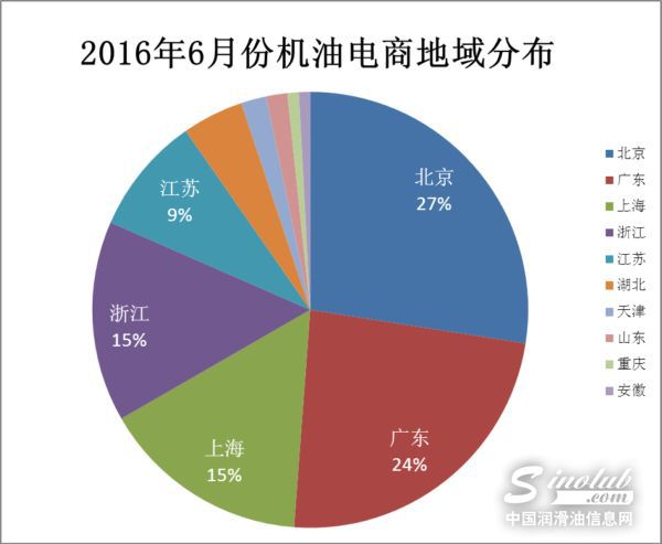 “北上广”作为领军角色,本月份依旧引领机油电商继续前行。北京地区本月表现依旧良好,占据了27%的市场份额,其次是广东,占有率为24%,上海与浙江以15%的占有率并列第三。总体来说,除偏远地域,2016年各月份全国各省市的电商机油店铺数量继续呈现出百花齐放的良好态势。