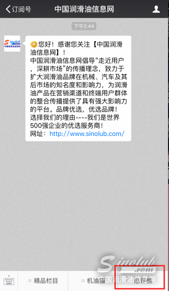 或关注“中国润滑油信息网”官方微信平台(微信号:sinolub),点击右下角“总评榜”,即可跳转至LubTop2016 微信H5投票系统。