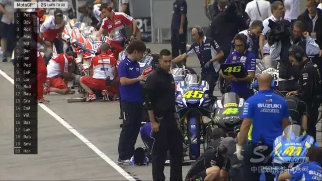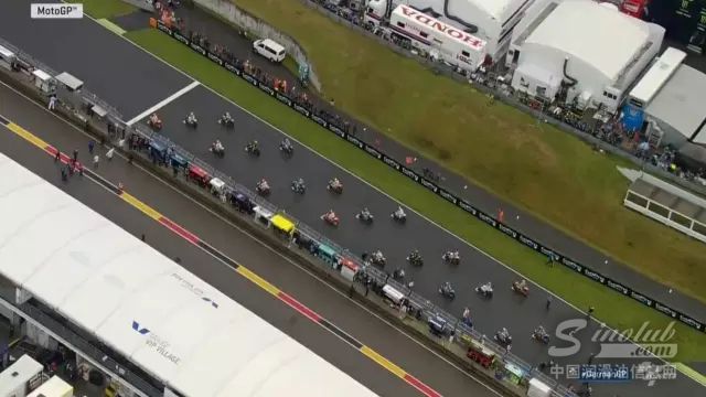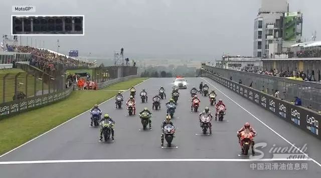 周末的萨琛林赛道一直处于阴晴不定的状态,气温更是高达40度。从先前的MOTO3比赛开始,赛道上的大雨直接导致先前MOTO3、MOTO2比赛中众多车手的摔车,直到MotoGP的正赛前才逐渐停止。正是因为赛道上还未散去的积水影响,参加正赛的车手们纷纷使用雨地车起跑。