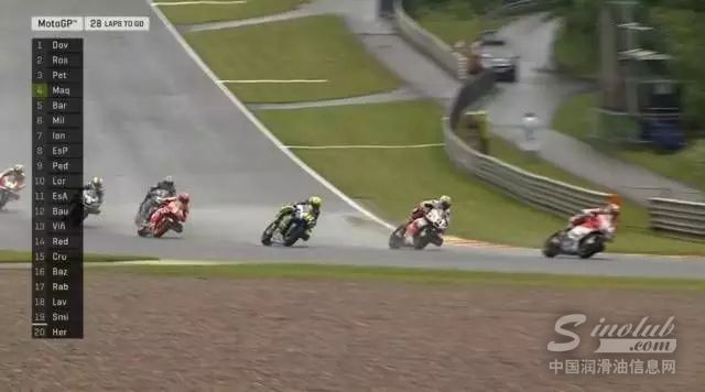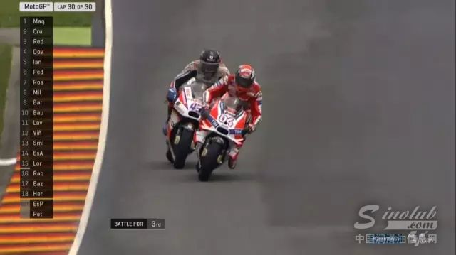 当比赛进行到第三圈时,杜卡迪车队的佩楚奇与多维齐奥索两位车手保持加速状态,一举超越雅马哈车队车手罗西,成为领先集团内的一员,正式上演厂队与卫星车队相争的戏码。