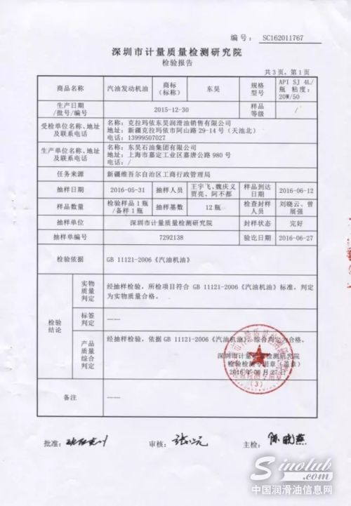 日前,新疆维吾尔自治区工商局在流通领域组织对克拉玛依东昊润滑油销售有限公司销售的标称东昊石油集团有限公司生产的东昊商标10W/20 API SM合成汽机油、10W/40 API SM合成汽机油、API SJ 4L/瓶汽机油、20W/50 CF-4柴机油、15W/40 CH-4 柴机油等产品进行了质量监测。经检验,合格率为100%。本次监督抽查依据CB 11121-2006《汽油机油》、GB11122—2006《柴油机油》标准要求,对东昊润滑油产品的运动粘度、粘度指数、高温高剪切粘度、低温动力粘度、倾点、闪点、机械杂质、泡沫性、水分等项目进行了监测,受检产品全部合格。