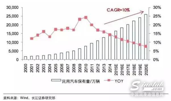 2014年,国内汽车保有量达1.46亿辆(民用车+商用车),并仍处于告诉增长周期,复合增长按10%计算,2020年保有量将达2.59亿辆。