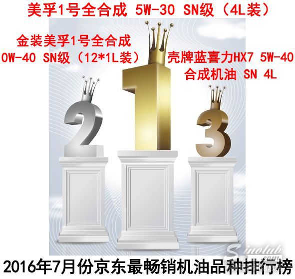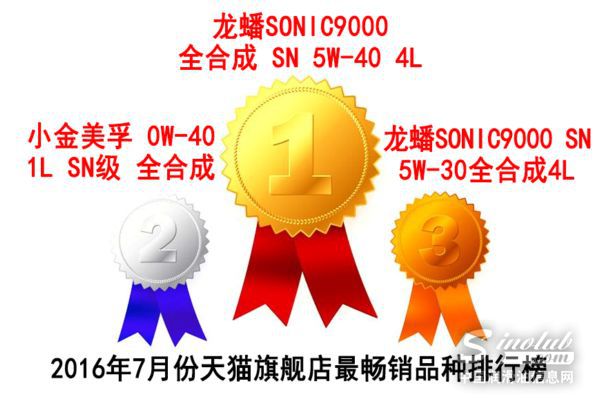 在2016年7月机油猫公布的天猫旗舰店畅销产品数据中,民族品牌龙蟠依然保持了电商龙头的地位,旗下的“龙蟠SONIC9000 全合成机油汽车发动机润滑油 SN 5W-40 4L”成交量超过5800件,夺得“最畅销产品”称号,登上冠军宝座。排名第二的是“Mobil 美孚一号 小金美孚 润滑油 0W-40 1L API SN级 全合成机油”,成交量超过2900件。排名第三的是“龙蟠SONIC9000 SN 5W-30全合成机油汽车机油汽油润滑油官方正品4L”,成交量为2582件。