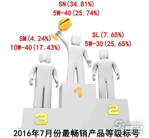 2016年7月份的机油畅销等级排行榜整体趋势保持稳定。高等级、高品质的机油在电商销售市场中,依旧占据绝对优势,备受广大车主的信赖和喜爱。本月,润滑油最高等级标号SN占据了市场成交量的34.81%,远远高于第二名SL等级的7.65%,独领鳌头。此外,在机油标号方面,“5W-40”本月份占据了25.74%的市场份额,以微弱的优势领先于标号“5W-30”,后者以25.65%的成交量比重排名第二,势头不容小觑。标号“10W-40”本月排名第三,获得了17.43%的份额。机油猫提醒车主,从实际用车需求来看,建议车主选择多个级别的机油,用以满足从低温到高温的广泛区域,适应温度的变化给予发动机更为全面的保护。