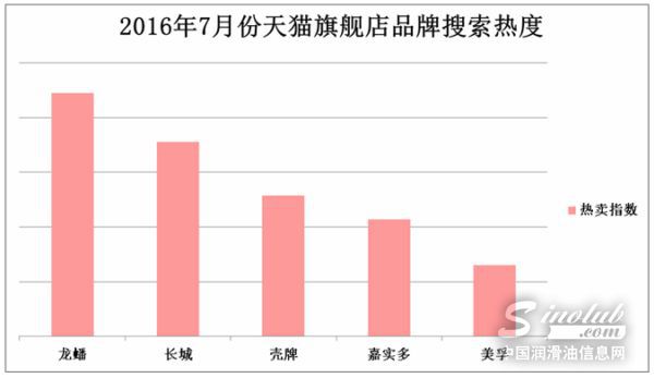 机油品牌的知名度在某种程度上影响着天猫旗舰店热度搜索排行。根据机油猫(m.sinolub.com)电商数据中心统计,2016年7月份,民族润滑油品牌龙蟠位列第一。作为后来者的龙蟠借力电商成功带动自身品牌知名度,值得其他润滑油企业的关注和借鉴。国内名牌长城夺得第二名,显示了民族润滑油在品牌塑造方面取得了显著进步。嘉实多、美孚和壳牌这些国际一线品牌虽然有所“退烧”,但是凭借其高度的国际品牌地位和多领域渗透的品牌影响力,在品牌搜索热度榜中依然名列前茅,本月分列第三、四、五名。