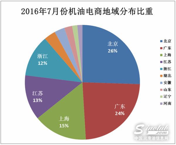 “北上广”作为领军角色,本月份依旧引领机油电商继续前行。北京地区本月表现依旧良好,占据了26%的市场份额,其次是广东,占有率为24%,上海在本月力压江浙,以15%的占有率位列第三。总体来说,除偏远地域,2016年7月份全国各省市的电商机油店铺数量继续呈现出百花齐放的良好态势。