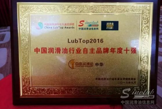 图:中华荣获“LubTop2016中国润滑油行业自主品牌年度十强”大奖。