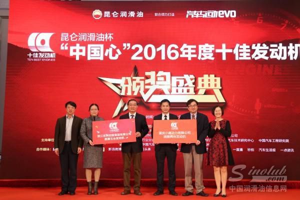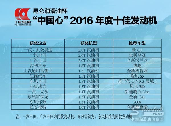 12月1日,在2016上海法兰克福汽配展展览会期间同期举办的昆仑润滑油杯“中国心”2016年度十佳发动机颁奖盛典上,备受业界瞩目的十佳发动机获奖名单隆重揭晓。来自一汽-大众、一汽-大众奥迪、一汽丰田、广汽丰田、江淮汽车、上汽通用、吉利汽车、东风标致、东风雪铁龙、小康动力、东风本田以及长安福特共十二个汽车企业的十款优秀发动机,从所有参评的40台发动机中脱颖而出,最终荣获“中国心”2016年度十佳发动机称号。