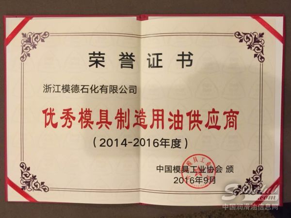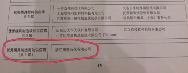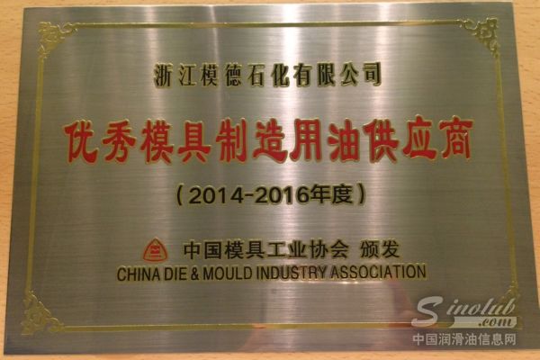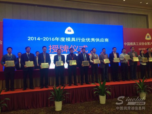 这次全国性的模具行业大会,达五百多人参加,浙江模德石化应邀参加此次大会。大会共评选出33家优秀供应商,浙江模德石化荣幸被中国模协评选为行业唯一的“优秀模具制造用油供应商”。