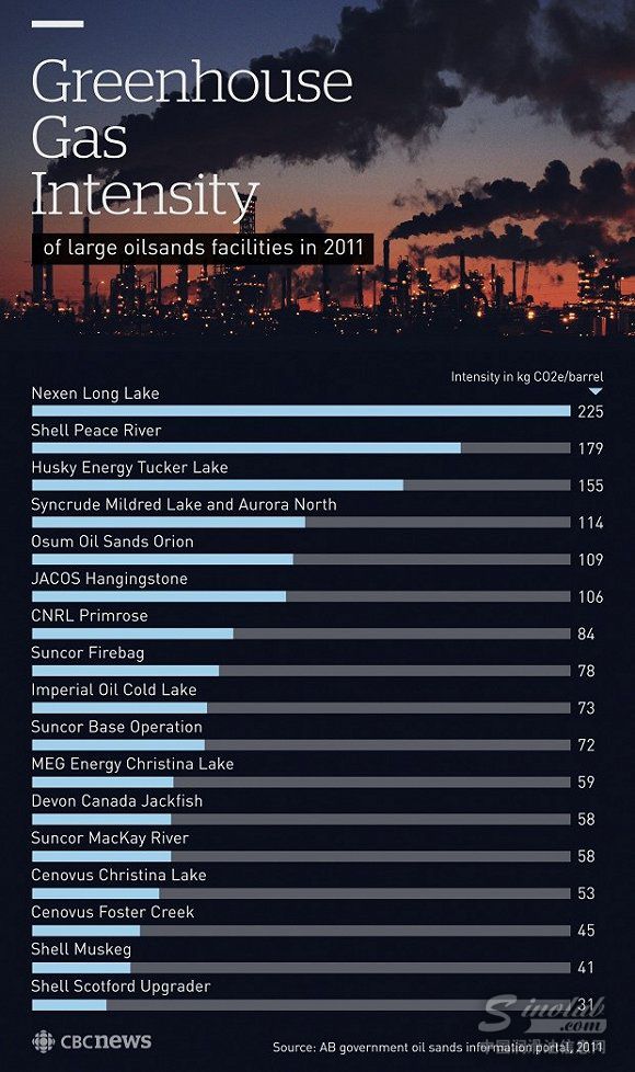 根据CBC2011年的统计数据,壳牌的三个大型油砂开采设施中,Shell Muskeg和Shell Scotford Upgrader的温室气体排放强度仅为为31千克/桶和41千克/桶。“Cenovus将从中赚钱,而尼克森(Nexen)有可能赔钱”。