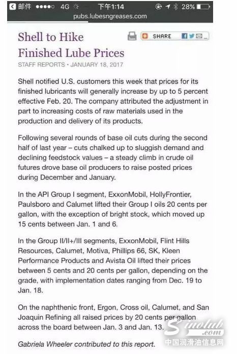 内容大意译为“壳牌本周通知在美用户,其成品润滑油的价格将从2月20日起增长达5%。该公司解释说本次调整主要是因为其产品生产和交付中使用的原材料成本上升。在2016年下半年进行了几轮基础油削减,由于需求低迷,原油价格下跌,原油期货的稳步攀升促使基础油生产商在12月至1月纷纷提高价格。”