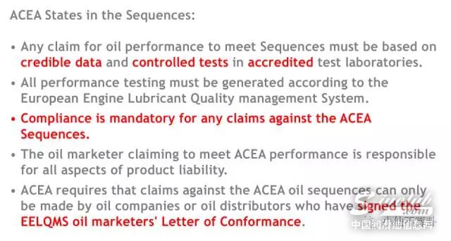 5.ACEA要求,只有签署了“EELQMS经营者承诺书 (EELQMS oil marketers' Letter of Conformance)” 以后,润滑油公司或者经销商才可以在产品上声明