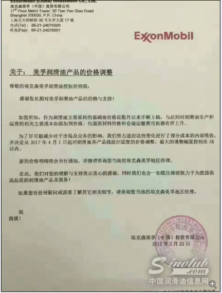 有关调整后的润滑油各产品线新的价格,美孚在通知函中表示,“新的价格明细将会另行通知,详情请咨询当地的埃克森美孚地区经理。”