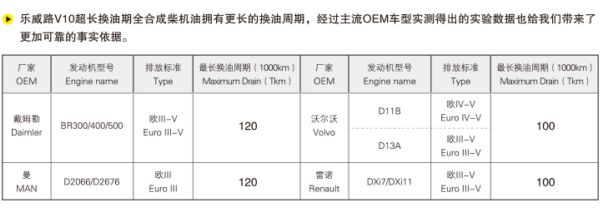 主流OEM车型实验数据表明,乐威路V10在标准工况下、标准燃油情况下可为车辆提供100000KM超长换油周期,同时,在控制油泥、烟炱沉积、保持油压稳定、减少摩擦损耗、酸中和能力、保持发动机清洁、延长垫片和密封件使用寿命等方面乐威路V10表现也十分出色,在提高车辆运营效率方面提供了卓越的润滑油解决方案。