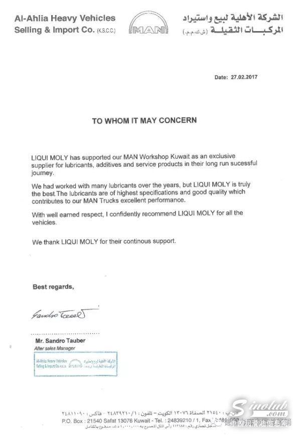 在科威特,力魔是曼牌卡车官方唯一指定养护品牌,长期为其提供润滑油、汽车养护及汽车美容用品,产品品质深得官方肯定。