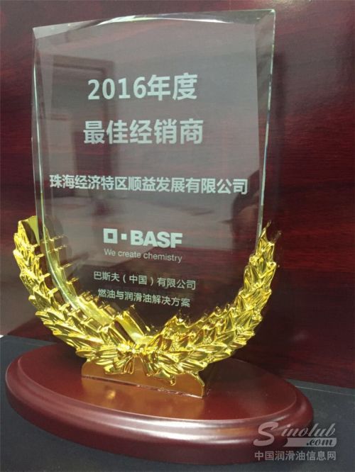 在充满挑战的2016年里,顺益体系(集团)业绩突出,被巴斯夫(中国)有限公司授予“巴斯夫2016年度最佳经销商”奖,并由巴斯夫(中国)有限公司业务管理总监杨延东先生为顺益体系(集团)总裁张建新先生颁发此奖项,以肯定顺益体系(集团)为巴斯夫燃油与润滑油解决方案做出的努力。