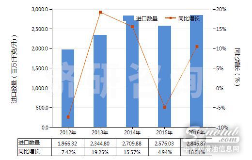 图 2012-2016年中国润滑油基础油(不含有生物柴油)(HS27101993)进口量及增速统计