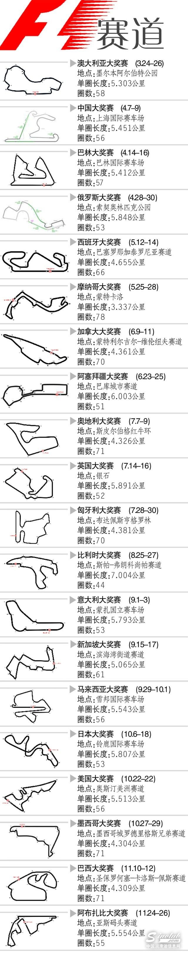 由于纽博格林赛道深陷财政泥潭,而霍根海姆也因财政压力不愿连续二年办赛,今年只有20场比赛,比去年少一场。去年,阿塞拜疆首都巴库首次举办了F1街道赛,而且被冠上“欧洲大奖赛”的头衔。今年比赛将继续进行,但是名字将变为阿塞拜疆大奖赛,使得“欧洲大奖赛”再次从赛历上消失。本赛季同样安排了两轮季中测试,但地点从原来的西班牙巴塞罗那和英国银石变为巴林和匈牙利。
