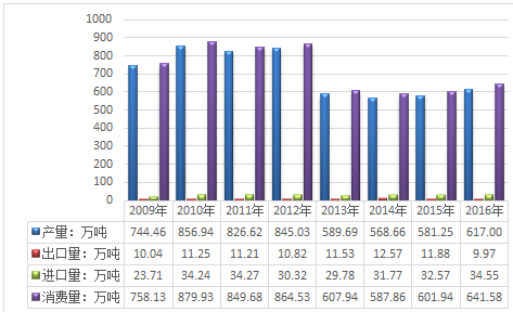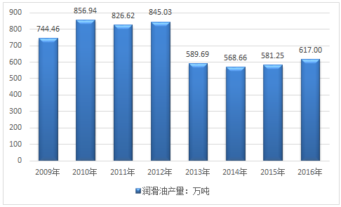 2010-2012年间国内润滑油产量一度达到856.94万吨的历史高点,2013年以来国内润滑油产量震荡下行;2015年我国润滑油产量约为581.25万吨;2016年国内产量同比增长6.14%,达到617万吨。