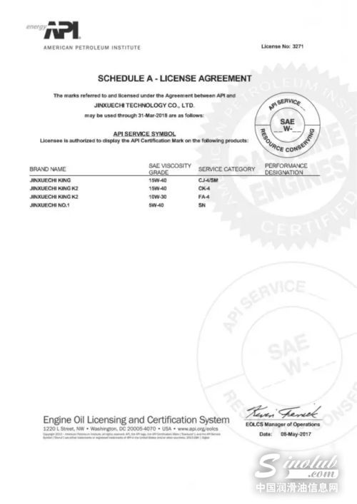 近日,金雪驰柴油机油同时通过了被誉为柴机油领域全球最高标准——API CK-4和API FA-4的认证,成功获得了API(美国石油协会)授予的认证证书。
