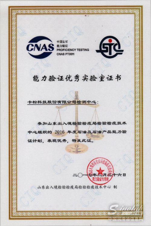 根据《检验检测机构资质认定管理办法》(总局163号令)和国家认监委《实验室能力验证实施办法》(2006年第9号公告),山东省出入境检验检疫局在全省范围内组织了“能力验证优秀实验室”评选活动。2016年7月,卡松科技股份有限公司检测中心积极参加了石油及石油产品能力验证计划,检测了有机热载体的40℃运动粘度、酸值、闪点、水分等项目。按照CNAS(中国合格评定国家认可委员会)的要求,所测结果均为满意。