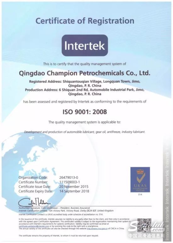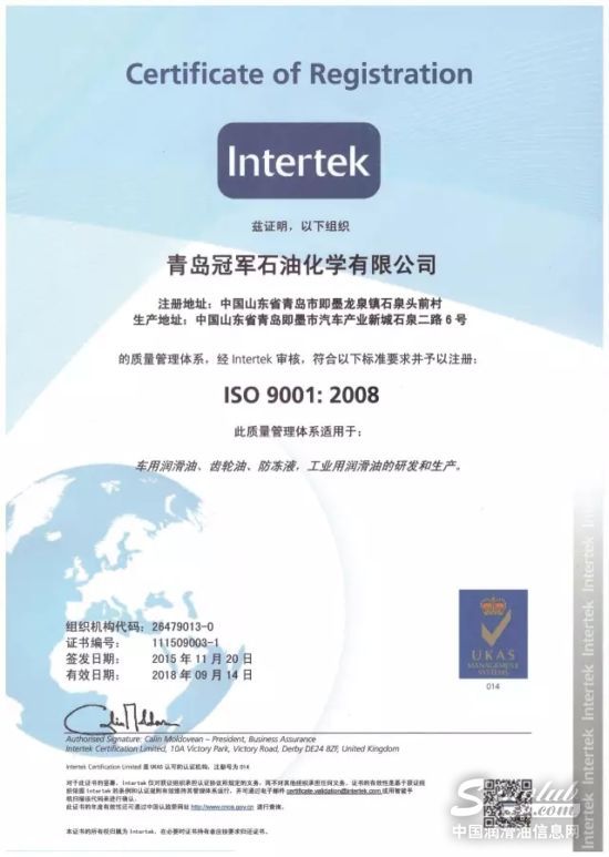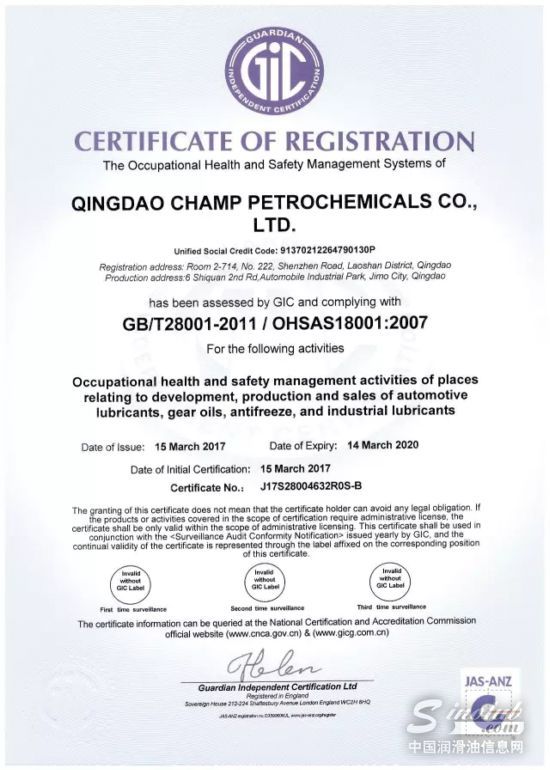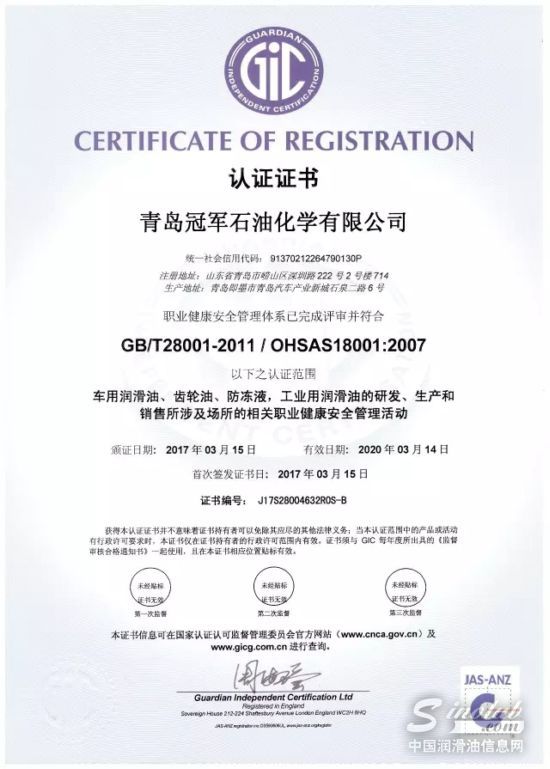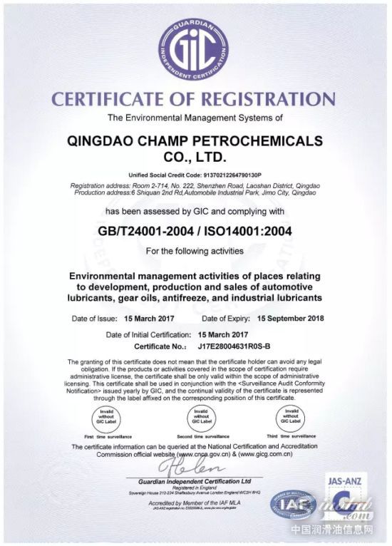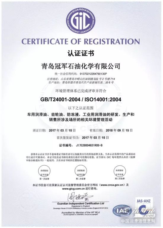 阳春三月,双喜临门:冠军®润滑油于近日通过了【ISO14001环境管理体系认证】和【OHSAS18001职业健康和安全管理体系认证】,与早期取得的【ISO 9001国际质量体系认证】构成“三体系”认证!标志着冠军®润滑油在环境管理领域和安全生产管理的科学化、规范化方面已达到了国际水平,建立起了规范、系统、开放、高效的现代管理体系。这对于立志成为高端民族品牌、剑指跨越式发展的冠军®润滑油而言,无疑具有里程碑式的意义。