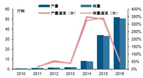 根据工信部统计,2016 年,我国新能源汽车累计生产 51.7 万辆,销量达 50.7 万辆,同比分别增长达 51.87% 和 53.13%。中汽协2017年6月发布数据显示,今年5月我国新能源汽车产销分别完成5.1万辆和4.5万辆,同比分别增长38.2%和28.4%。这意味着,在走出今年初补贴退坡、准入目录重审的阴影后,我国新能源汽车产销量开始重回“快车道”。