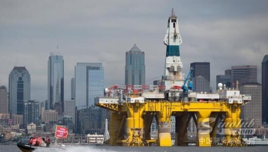 资料图:图为壳牌壳牌石油钻机在前往北冰洋勘探石油之前,停泊在西雅图港口。