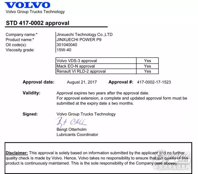 2017年8月21日,新疆金雪驰科技股份有限公司金雪驰品牌劲驰 POWER P9 15W/40柴油机油经过瑞典沃尔沃公司的严格测试,顺利获得该厂认证。这是金雪驰产品继获得美国马克、法国雷诺、美国康明斯认证后,再次获得的国际知名汽车制造企业认证。该认证的颁发标志着金雪驰产品的优质品质可以与国际润滑油的最新发展保持同步,能够满足我国汽车行业发展的最新需要,展示了金雪驰产品的国际品质,展现了金雪驰打造高质量产品的决心和步骤。