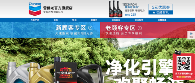 目前,雪佛龙已在天猫商城拥有一家“雪佛龙官方旗舰店”,主要售卖机油系列产品以及汽油添加剂等。天猫雪佛龙官方旗舰店网址:https://chevron.tmall.com