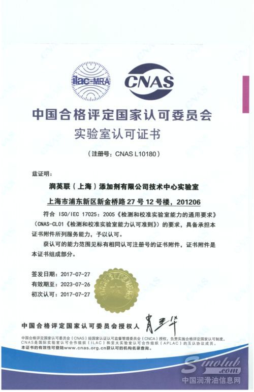 全球润滑油及燃油添加剂研发、生产和销售领先企业——润英联旗下的中国商务技术中心实验室日前通过ISO/IEC17025:2005检测实验室管理体系认证。ISO17025是实验室认可服务的国际标准,通过认可的实验室出具的报告受到全球专业组织的认可。此项认证的通过标志着润英联中国商务技术中心实验室在管理、质量控制和检测技术能力等方面均已处于国际同行业领先水平,并具备按国际认可标准开展可靠检测服务的能力,这是润英联中国商务技术中心不断加强实验室自身建设与管理、增强市场竞争能力的又一次进步。
