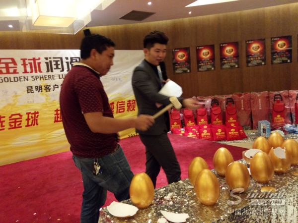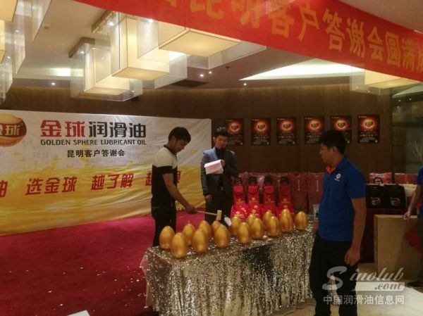 接下来金球润滑油销售总监李启才先生宣布此次来到昆明,在进行昆明地区客户答谢会的同时,还为大家讲解金球石化公司的发展历程及金球产品的技术知识,更为大家参加此次答谢会制定了一系列促销政策活动,在价格优惠的同时还为现场订购者提供了丰富的礼品,政策一经公布,就引起了在场所有嘉宾的兴趣和注意力,大家纷纷向工作人员交预付金,产品订单纷至踏来,一时间令在场的工作人员应接不暇。经过近90分钟的订购过程中,凡现场订购者都可以参加砸金蛋送大礼活动,现场随即产生了2位夺得大奖的嘉宾,获得了49寸网络彩电、冰箱及金球礼包,将活动推向气氛热烈的高潮,现场热情瞬间被点燃。