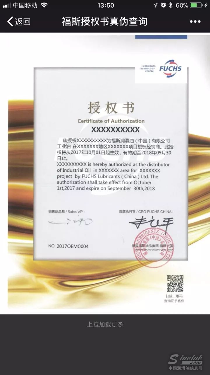 客户在业务活动中,可扫描证书右下角的二维码,直接进行福斯经销商授权书的真伪查询。查询结果显示应与纸质证书完全一致。