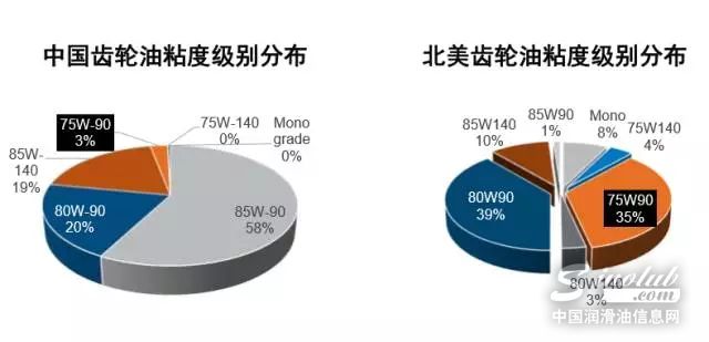 路博润统计了中国及北美商用车市场齿轮油的粘度级别分布并进行对比。从统计图来看,中国市场目前占主流的级别依然是85W-90,而北美市场85W-90已经缩窄到1%,75W-90则占到了35%的份额。林晓明认为,两个市场间的差异程度与OEM油品发展阶段密切相关,但是足以预见中国市场的发展趋势很大可能将沿袭北美,75W-90粘度级别具有巨大的市场增长潜力。
