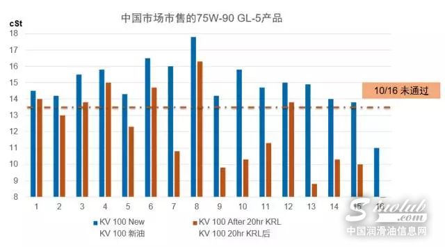 对于当前中国市场销售的75W-90 GL-5产品情况,路博润进行了抽样测试。在随机抽取的16个样本中,新油KV 100粘度合格的为15个,而在20小时的KRL实验后,KV 100仍然合格的只有6个。林晓明指出,这说明国内市场目前的齿轮油配方与未来新标准还存在较大差距,相信随着新国标的颁布,市场将会逐步规范起来。