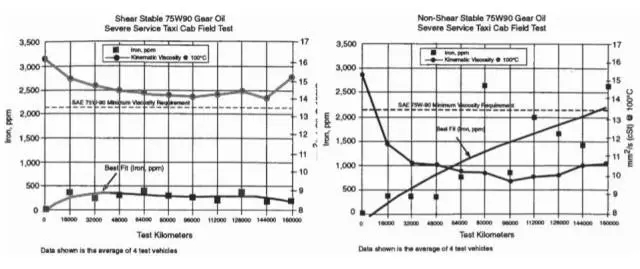 林晓明还现场展示了路博润此前在乘用车后桥做的行车试验,分别采用的是剪切稳定和不稳定的75W-90样品。试验发现,剪切稳定的75W-90粘度和铁含量变化在16万公里路试中始终表现平稳,剪切不稳定的75W-90在1万公里后粘度就出现大幅衰减,且铁含量最后接近2500ppm,大幅超出国标标准。而在台架试验中也得出了同样的结果,当使用剪切稳定的齿轮油增粘剂时,粘度下降非常有限,如果采用剪切不稳定的增粘剂,粘度下降就会相当明显,且出现较早的失效。在换油周期不断延长的大环境下,粘度保持对硬件的保护是至关重要的。