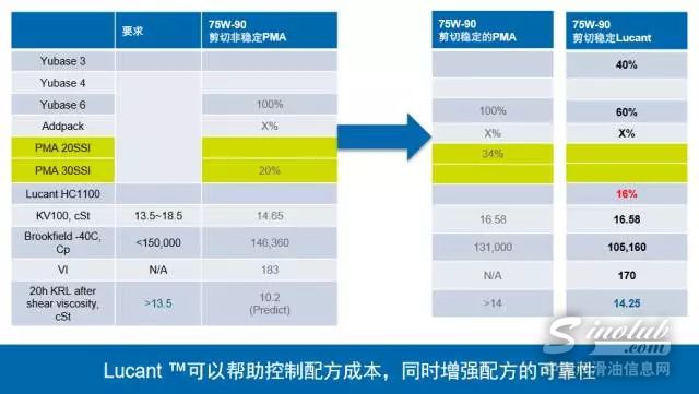 如何既实现剪切稳定的配方又能够达到最优的成本呢?针对新国标的要求,路博润基于三类基础油的Lucant™增粘剂产品可提供有效解决方案。Lucant™增粘剂在润滑油市场上的运用已有十多年,可用于车辆传动系统和工业润滑油。该产品拖曳力低、剪切稳定性佳、低温性能突出并具有极好的增稠性,能覆盖75W-90到75W-140的所有粘度级别,简化了增稠剂库存,且在其优化后增粘剂的加入量仅为16%,可有效控制配方总成本。
