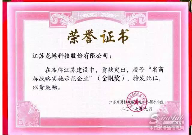 近日,江苏省商标品牌战略三年行动计划推进会在南京召开,会上颁发了“省商标战略实施示范市县”(金风奖)和“省商标战略实施示范企业”(金帆奖)。龙蟠科技股份有限公司从一众企业中脱颖而出,被授予“省商标战略实施示范企业”(金帆奖),成为南京经济技术开发区唯一获得此项荣誉的企业。