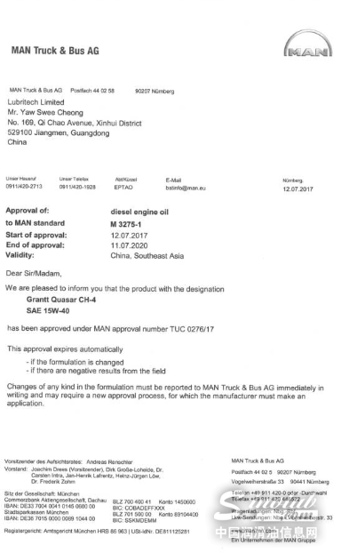 经过严格的测试,GRANTT格灵润滑Quasar 劲量CH-4 15W40 终于获得德国MAN公司M 3275-1认证。MAN发动机技术一直处于行业领先,其认证也被行业广为认可,属于国际权威认证。随着欧洲发动机技术不断地引入国内,众多引进欧洲发动机技术的国内OEM厂家均要求发动机油取得该认证。