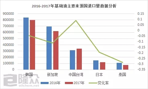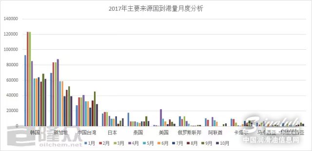 从进口来源国的月度分析来看,前三名的进口来源国在10月份均出现下滑,主要9月、10月的进口资源市场价格较为稳定,成交较为平淡,润滑油企业表示因环保检查,终端用户需求并不强烈。因此,工业润滑油企业只接到很少的订单。10月份的进口状况并不是非常积极。不过随着环保力度的进一步加大,终端下游的库存低位下出现一波补货行情,加之国内的企业受环保要求减产限产或错峰生产,国内供应偏紧态势下引发市场一波推涨,11月国内市场累计涨幅在500-600元左右。进口资源也水涨船高,台塑150N、500N价格在11月份一步到位,顺势推涨600-700元左右。市场主要靠消化前期进口量,资源量已经非常紧张。而12月份临近年底,国内的进口资源量也不会有太大的波动,虽然国内终端用户库存已经处于中高位,接下来需要一段消化的时间,但供应量的平衡在一定程度上仍然会支撑市场高位盘整一段时间。